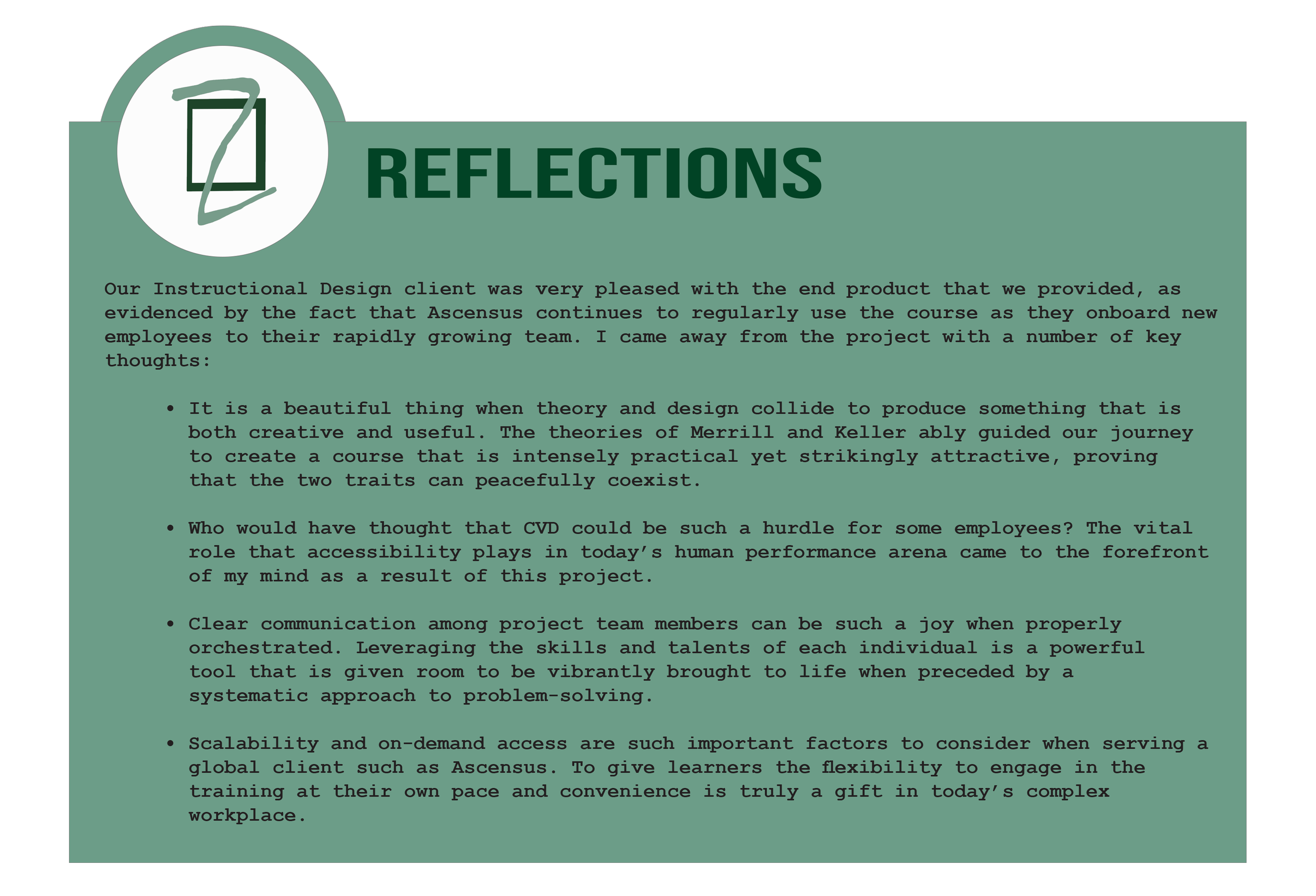 Fourteen members of the L&OD team completed the training. Ascensus leadership did not solicit nor receive feedback on the training course.The Enable Accessibility Accommodations for Employees with Color Vision Deficiency (CVD) course was delivered to all employees in the L&OD department. The L&OD team embraced the training and indicated they were surprised to learn about the challenges individuals with CVD face. They were motivated to review and update previously developed training content to make it CVD accessible. They also committed to incorporating best practices into any new education they develop.