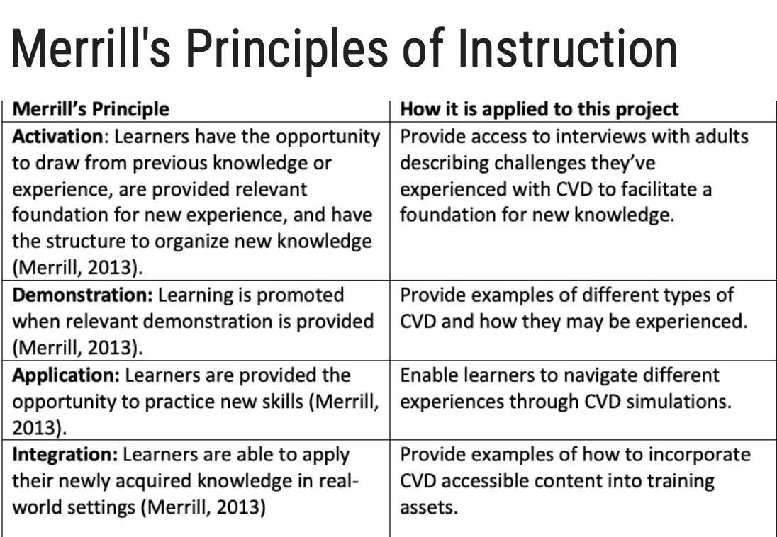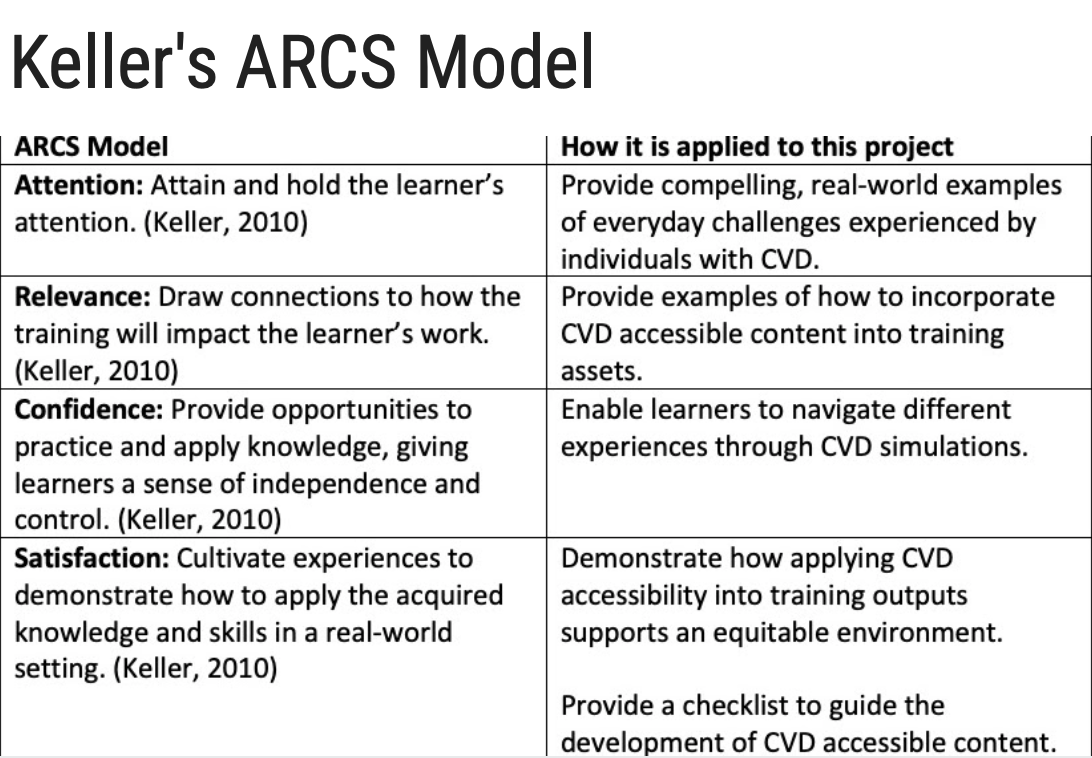 The L&OD team needs to know what CVD is, how it impacts those with the condition, and how to design and deliver training that is accessible to the associates with CVD. The project team concluded that the solution includes training about CVD and how it impacts associates with the condition. An associated job aid or checklist provides guidelines on how to incorporate CVD accessibility into future training outputs. The decision to develop eLearning to address this performance gap instead of an instructor-led solution was motivated by a need for scalability and on-demand access.